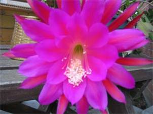几年来在人的浇育之中,这一盆仙人掌从来不开花,而当把它放在自然的怀抱里,造物主却让它开出了我从来没有看到过的这么惊艳的仙人掌花来。它粉红色的每一花瓣,都尽情张开,开得是这么自信和乐观,让人感到一种自强而向上的强烈尊严。