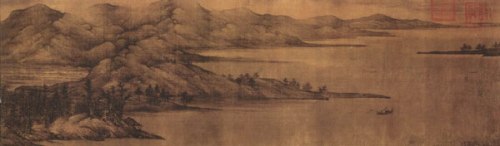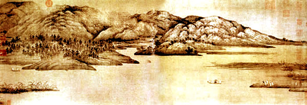 夕阳下的欧肯纳根湖,和上面的董源《夏景山口待渡图》的画的局部,还有下面的《潇湘图》(不管是不是董源的真迹)太像了。