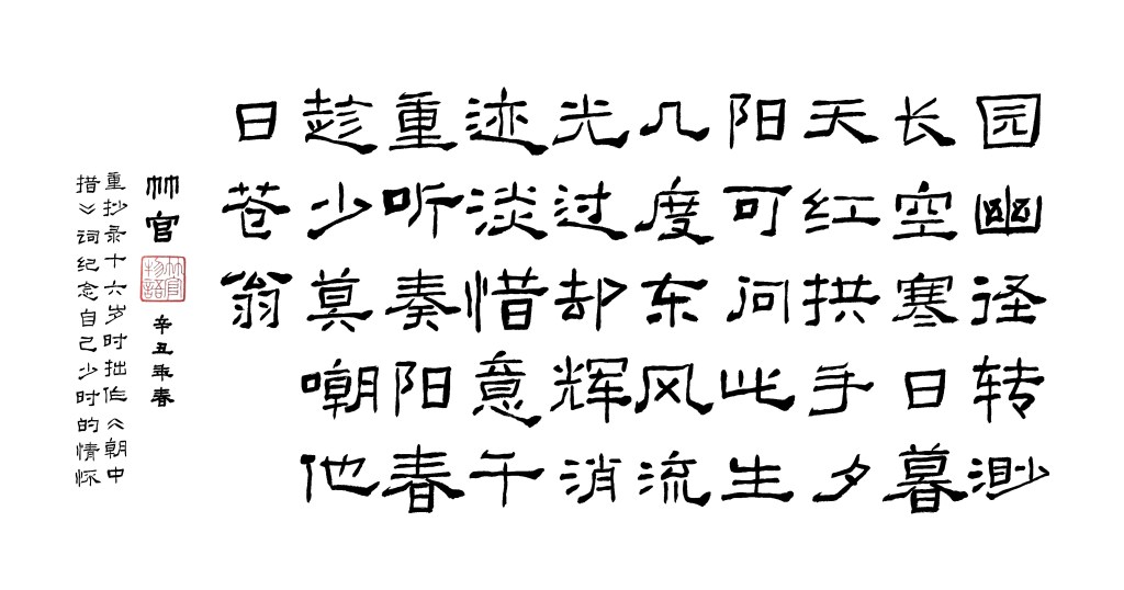 《朝中措》这个词牌的“朝中”指的是朝廷,为帝王接受朝见和处理政事的地方,亦为中央政府的代称。北宋嘉祜元年(1056年),欧阳修任翰林学士朝散大夫尚书吏部郎中知制诰充使馆修撰,为送友人刘敞守扬州而有了创调之作《朝中措 · 送刘仲原甫出守维扬》:“平山栏槛倚晴空,山色有无中。手种堂前垂柳,别来几度春风?文章太守,挥毫万字,一饮千锺。行乐直须年少,尊前看取衰翁。” 少时的我第一次填《朝中措》,自然和了欧阳修创调之作的同韵。这次抄录时,我顺便改了自己填的原词里的一两个字,比如把“莫笑他日苍翁”改成了“莫嘲他日苍翁”,以便更符合平仄词律。