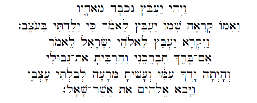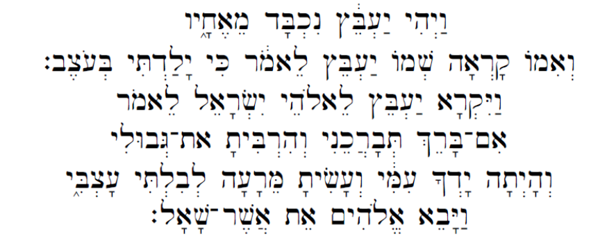 研经读经回归到旧约圣经希伯来原文和最原始的古老译本之后,我今天终于明白了,旧约《历代志上》 4:9的完整和准确的中文翻译应该如此:“雅比斯比他的众弟兄受苦负轭更重,他的母亲称他为雅比斯(意为“一个受父母亲如同对自己的眼睛一样疼惜的急产儿”),说:‘我的确在坠痛中急产生下了他。’”