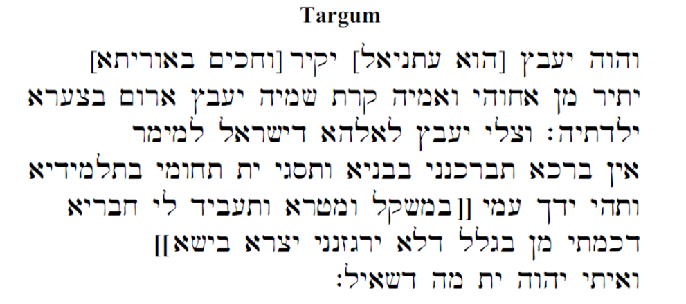 和《塔古姆》亚兰语意译本对“雅比斯的祷告” 的内容做以上相同解释的,也可见于《塔木德》(希伯来文:תלמוד,英语:Talmud)这个文献里。《塔木德》起源于流传了三千三百多年的羊皮卷手抄本,是一本许多犹太人至死都会研读,把其地位视为仅次于《圣经》的典籍。《塔木德》汇集了犹太人传统上口耳相传的犹太教律法条例、传统习俗、祭祀礼仪论著和注释,印刷出版于公元前2世纪至公元5世纪间。《塔木德》的Teruma 16a章节明确给我们指出了雅比斯的以下真名和身份:他的名字叫犹大(Judah),是西缅的兄弟。 他被称为俄陀聂(Othniel),因为上帝回应了他的祈祷。 他也被称为雅比斯,他在犹太人中传播 “妥拉”(希伯来语:תּוֹרָה,英语:Torah)。“妥拉”是犹太人律法的总和,既包括书面摩西五经”(希伯来语:תורה שבכתב),也包括“口头摩西五经”(希伯来语:תורהשבעלפה)。犹太人传统上认为“妥拉”中所有的教义(包括书面和口头)都是由上帝通过先知摩西在西奈山和会幕传授的,口头妥拉则包括了各个时期犹太教祭司对妥拉中内容的诠释。在每个犹太教徒眼里,“妥拉”是上帝和人类产生联系的唯一桥梁, “妥拉”的内涵就是:上帝给予人指导,用以引导他的生活。